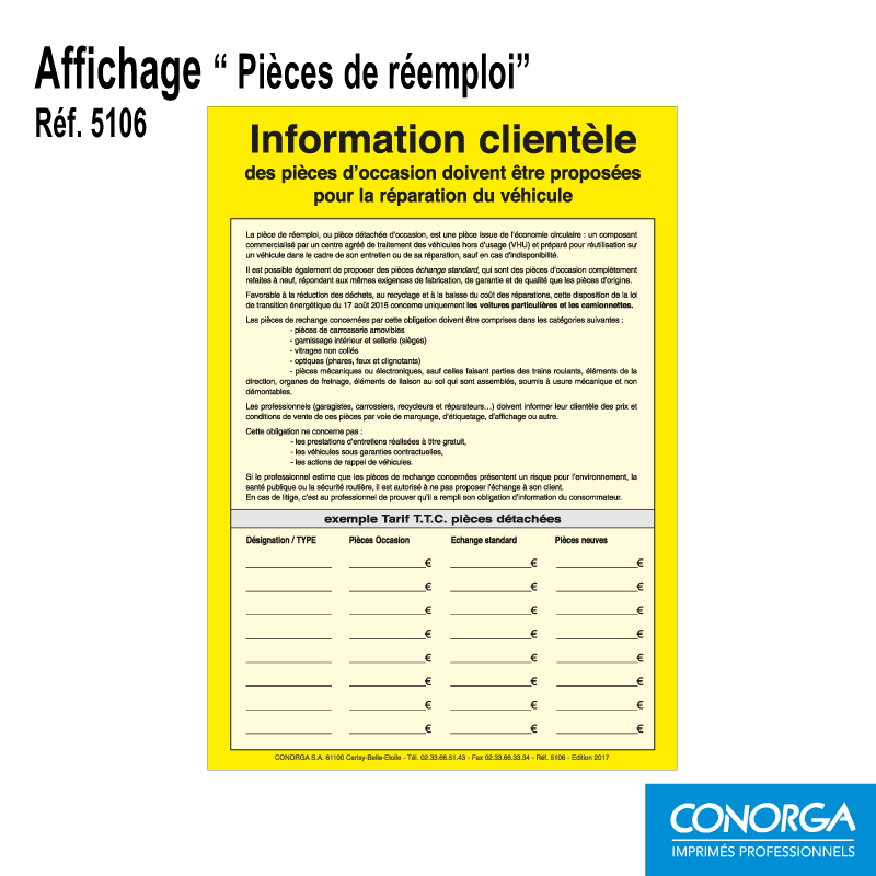 Le professionnel est tenu d'informer sa clientèle de la possibilité d'utiliser des pièces détachées de réemplois et d'occasion en indiquant la disponibilité, le prix et les conditions de vente de ces pièces.