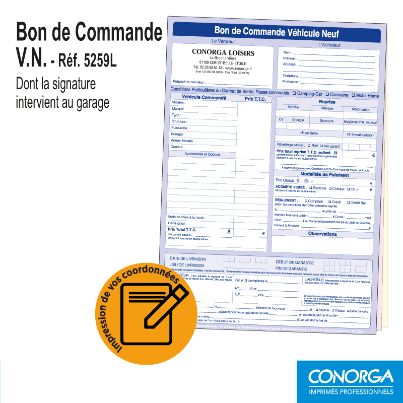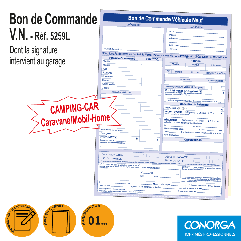 Bon de Commande V.N. Spécial Camping-Car, Caravane, Mobil-Home dont la signature intervient au garage.